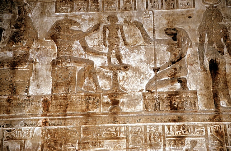 Khnoum (Chnouphis), le dieu-potier d’Esna modelant, façonnant sur son tour le « rmṯ/rémètch », l’être humain. Il est secondé dans sa tâche par sa parèdre Heqet (déesse grenouille protectrice de la parturiente) qui présente l’Ankh aux narines du « rmṯ/rémètch » pour lui donner la vie.
